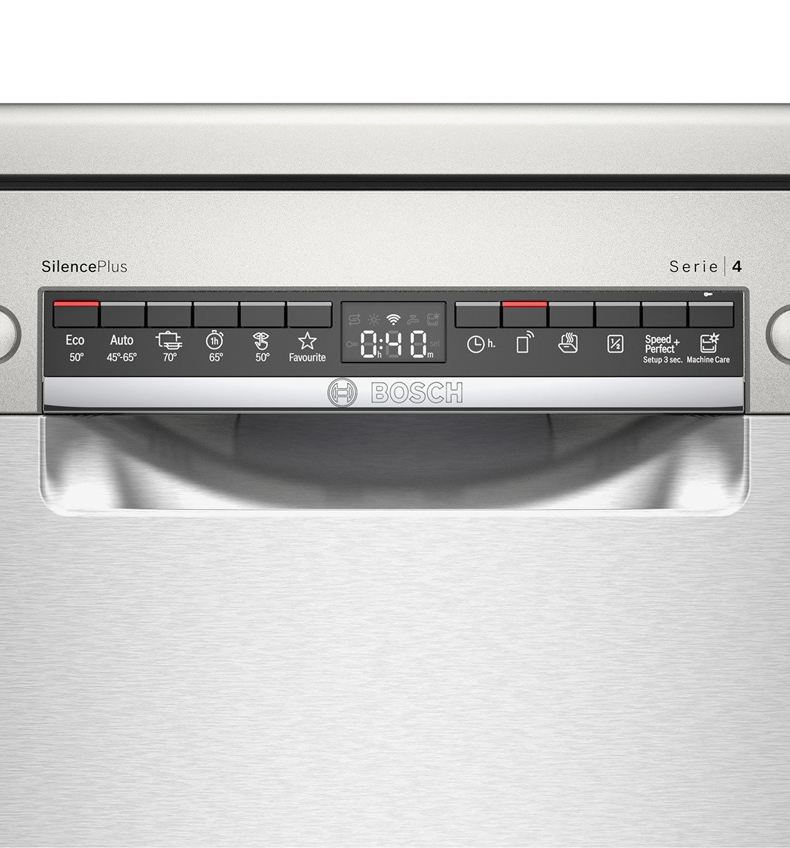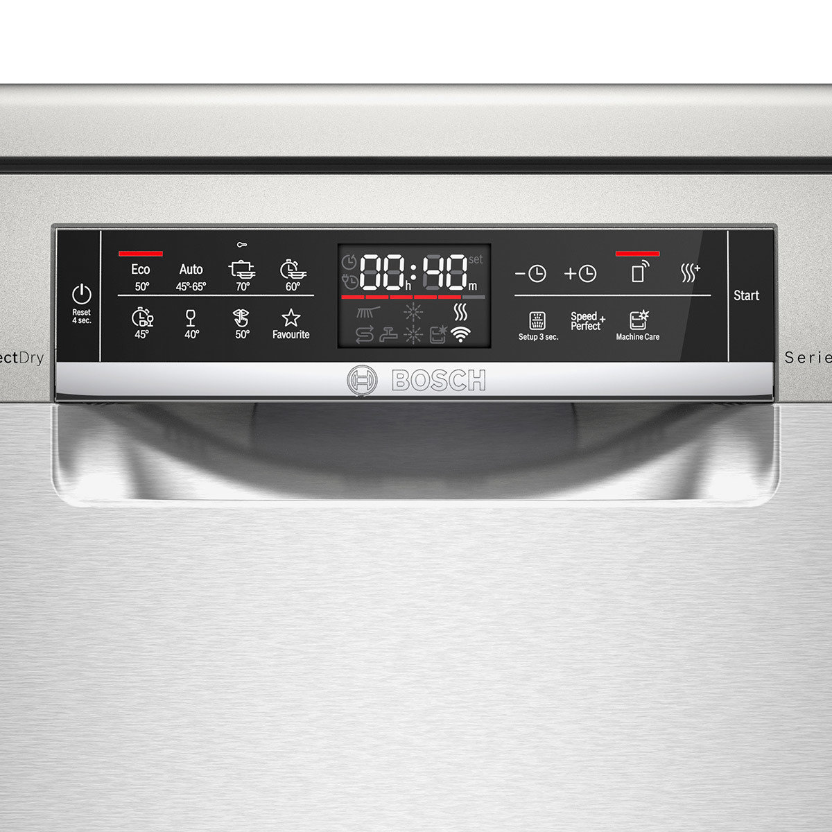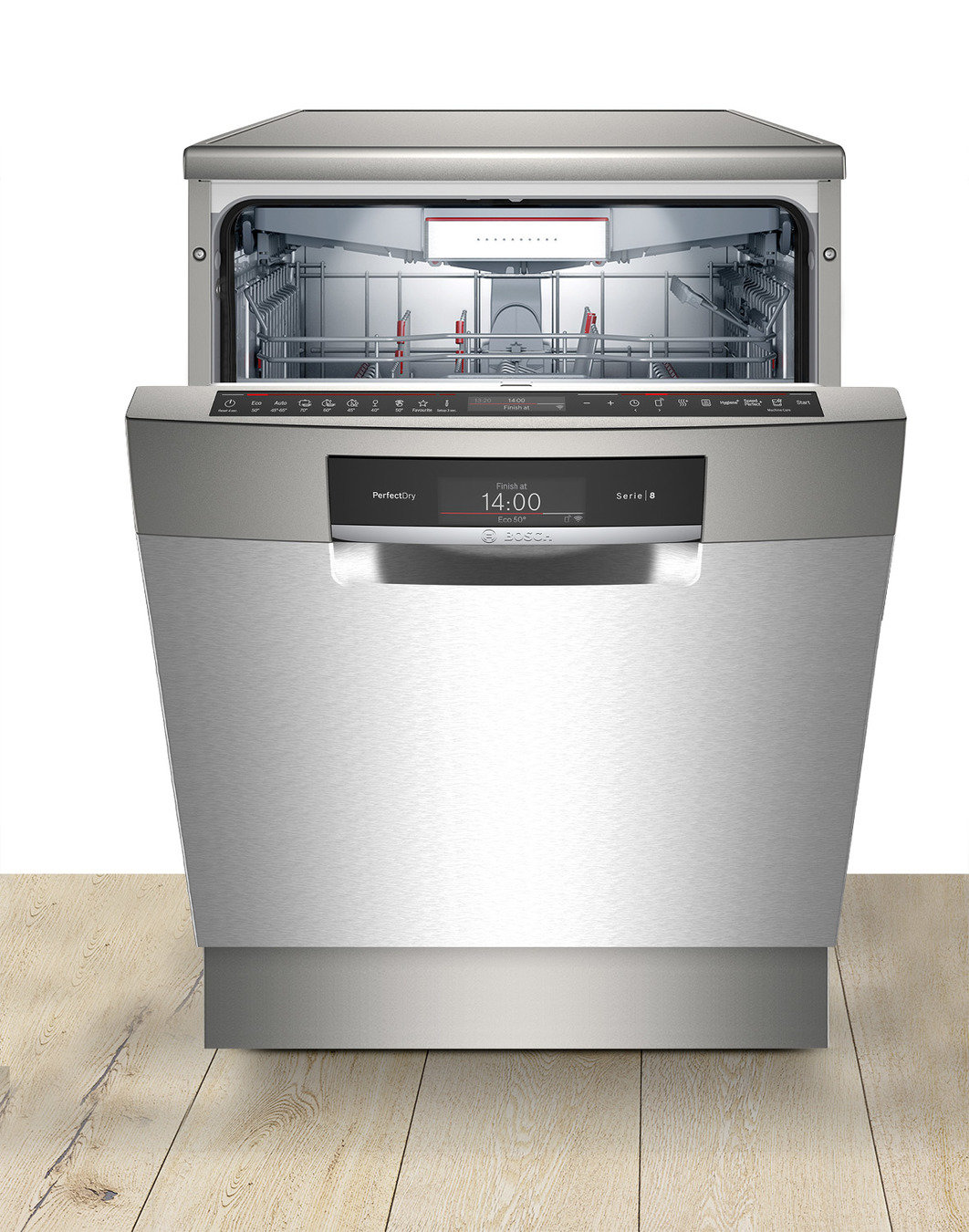 Wyświetlacz LCD zapewnia szybki przegląd informacji dotyczących postępów w zmywaniu, czasu pozostałego do końca programu i sprawia, że obsługa jest teraz bardziej intuicyjna. Co więcej, wyświetlacz pokazuje także poziom soli oraz środków wspomagających płukanie.