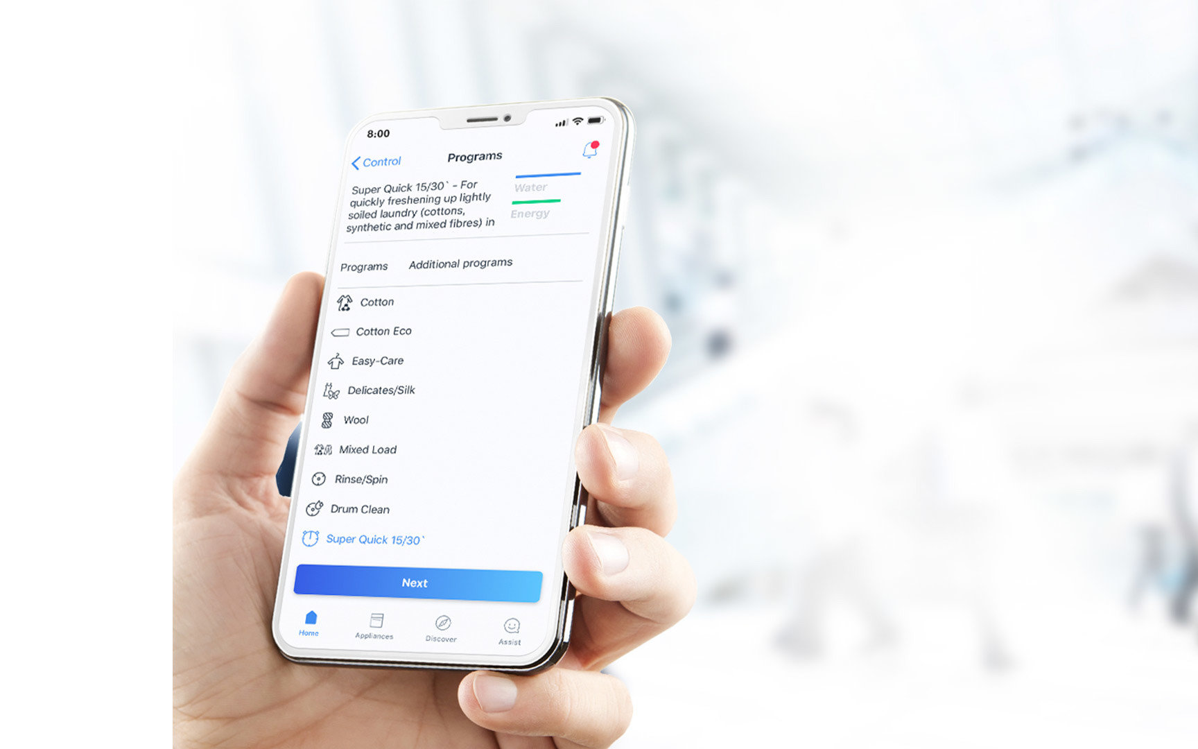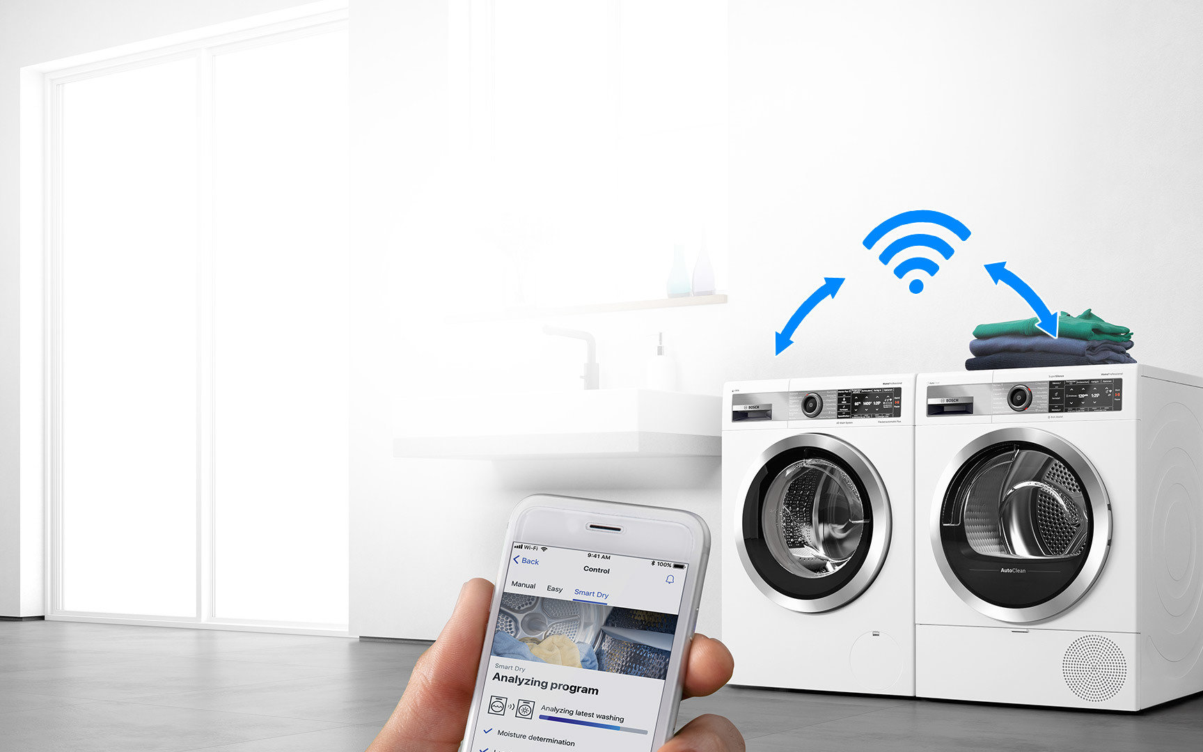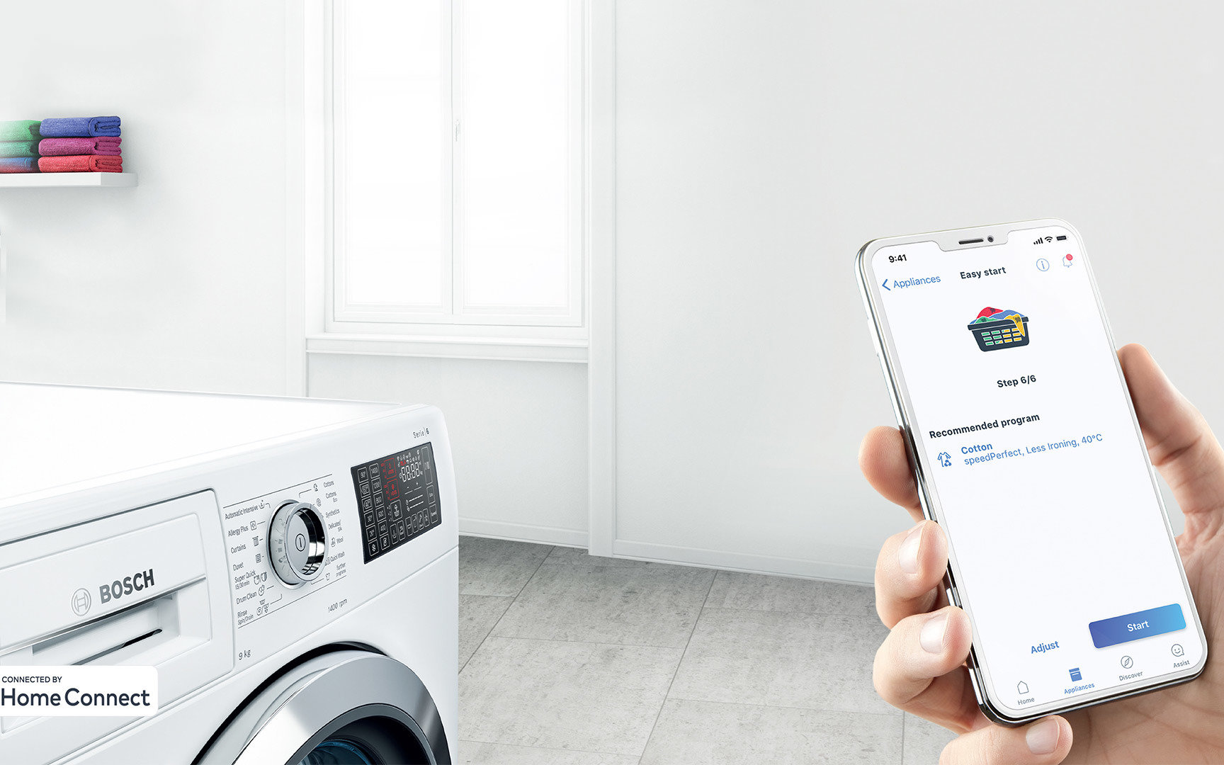 Za pomocą aplikacji Home Connect można włączyć pralkę, wybrać program lub zapauzować cykl prania, aby dorzucić do bębna rzeczy, które zostały zapomniane. Aplikacja Home Connect przesyła również powiadomienie push o ukończonym cyklu prania. Dodatkowo aplikacja Home Connect pozwala na konfigurację pralki; można zwiększyć głośność sygnałów dźwiękowych lub wyregulować ustawienia i-DOS.