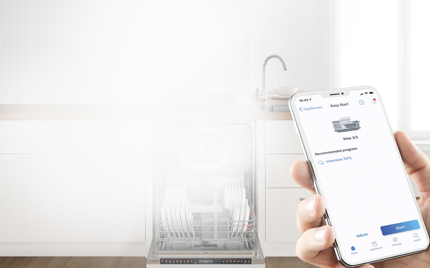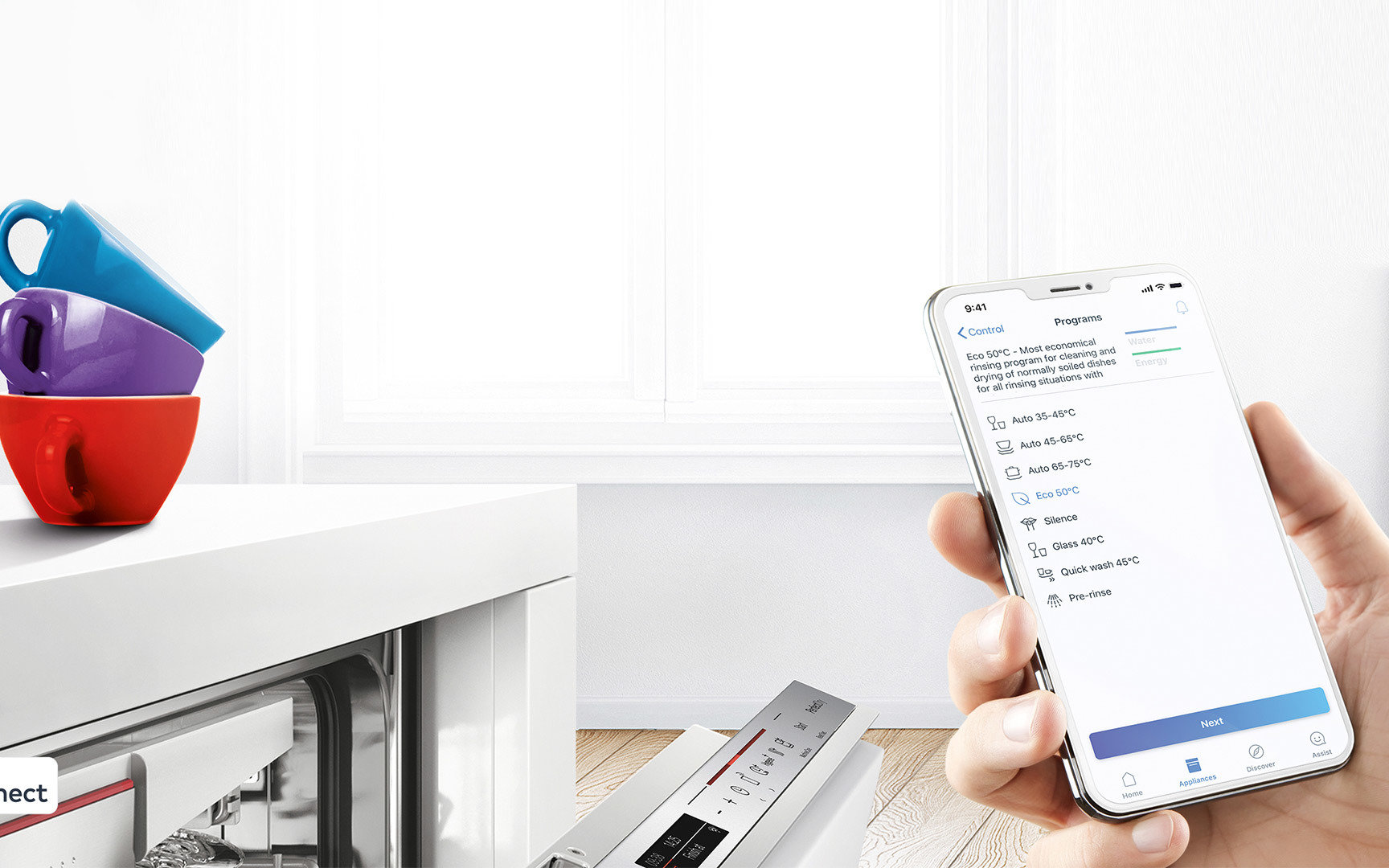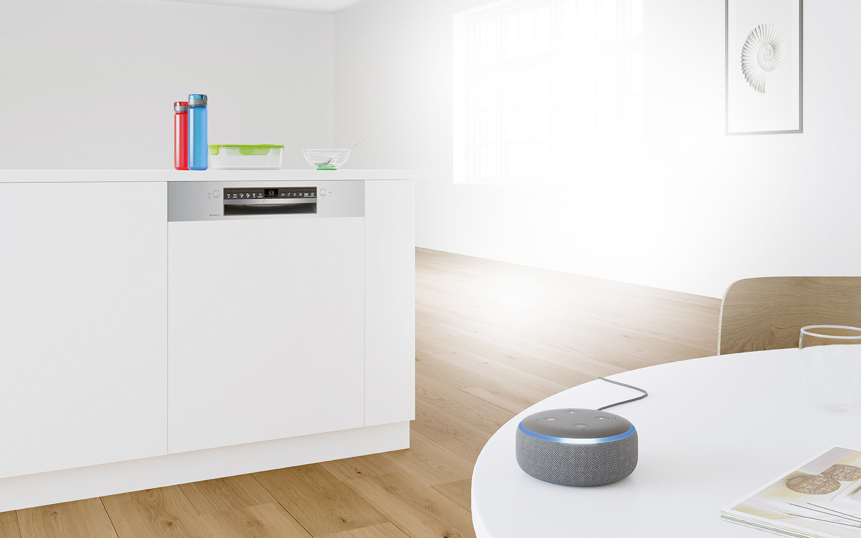 Idealnie umyte i wysuszone naczynia? Zmywarki z Home Connect nie tylko oferują opcję nastrojowego oświetlenia w kuchni, ale także ułatwiają codzienne życie, dzięki inteligentnym programom zmywania i szeregowi dodatkowych funkcji dostępnych tylko z poziomu aplikacji.