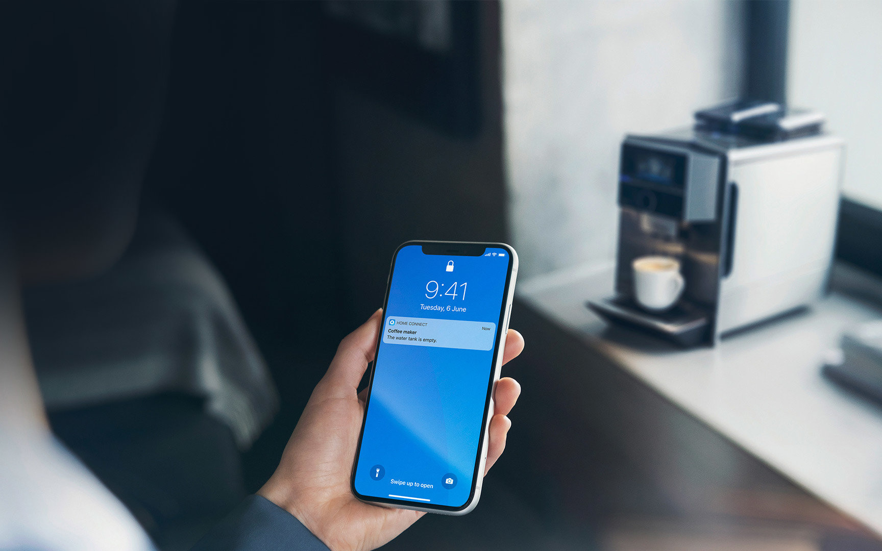Aplikacja Home Connect przesyła na smartfona powiadomienia dotyczące czyszczenia i odkamieniania ekspresu