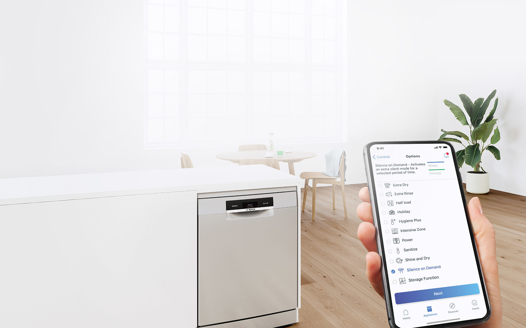 Coraz częściej mamy kuchnie otwarte na salon i w związku z tym nawet niewielki hałas powodowany pracą różnych sprzętów kuchennych może być uciążliwy. Dlatego zmywarki z systemem Home Connect zostały wyposażone w funkcję Silence on demand. Wystarczy w aplikacji wybrać tę opcję i na pół godziny zmywarka zostanie zapauzowana,
