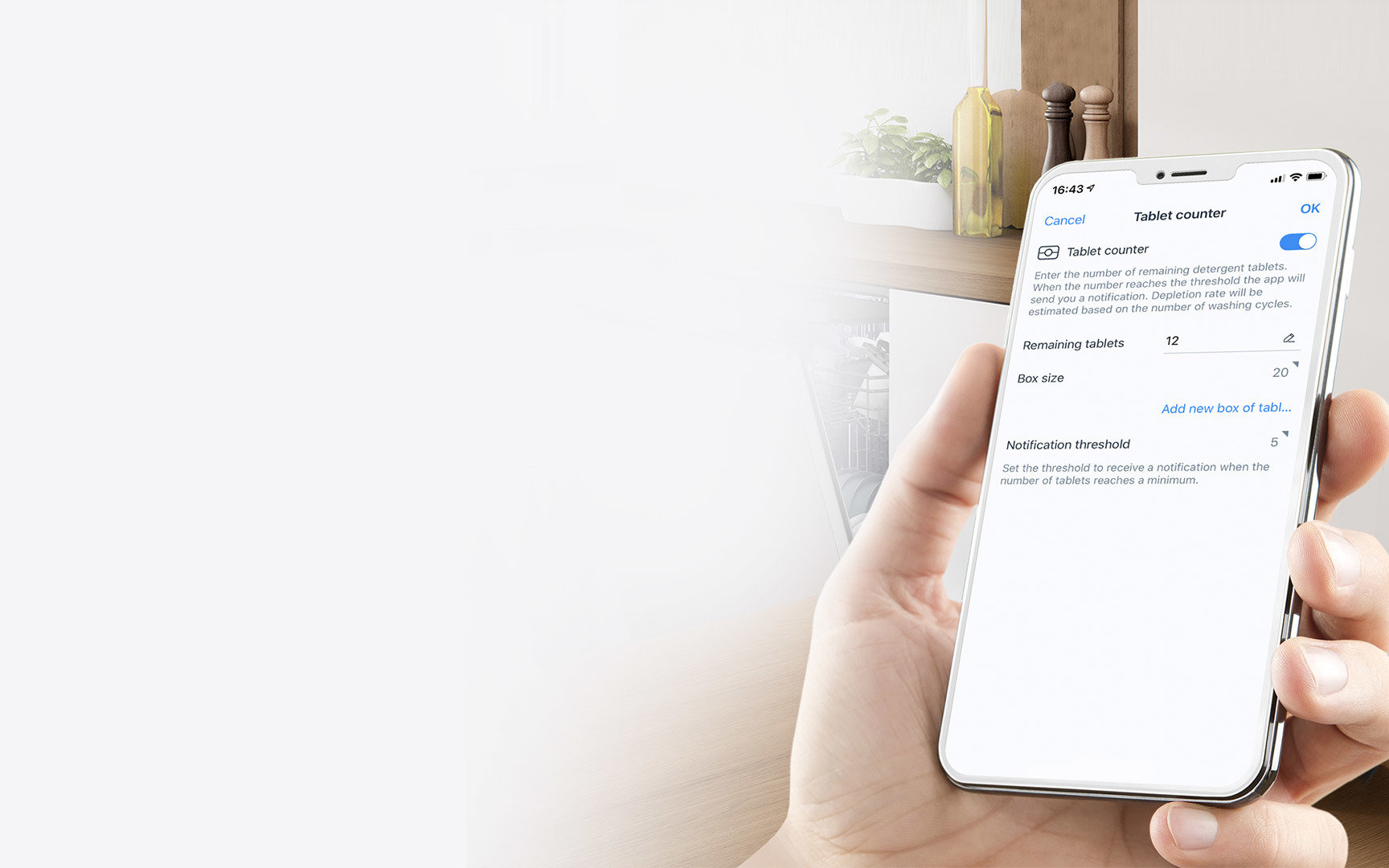 Z aplikacją Home Connect nigdy nie skończą się tabletki do zmywarki. Po zakupie należy wpisać ilość kupionych sztuk, a po każdym cyklu mycia naczyń aplikacja odejmuje jedną od ilości tabletek w zapasie i poinformuje powiadomieniem push na telefon, gdy stan zapasów będzie niski.