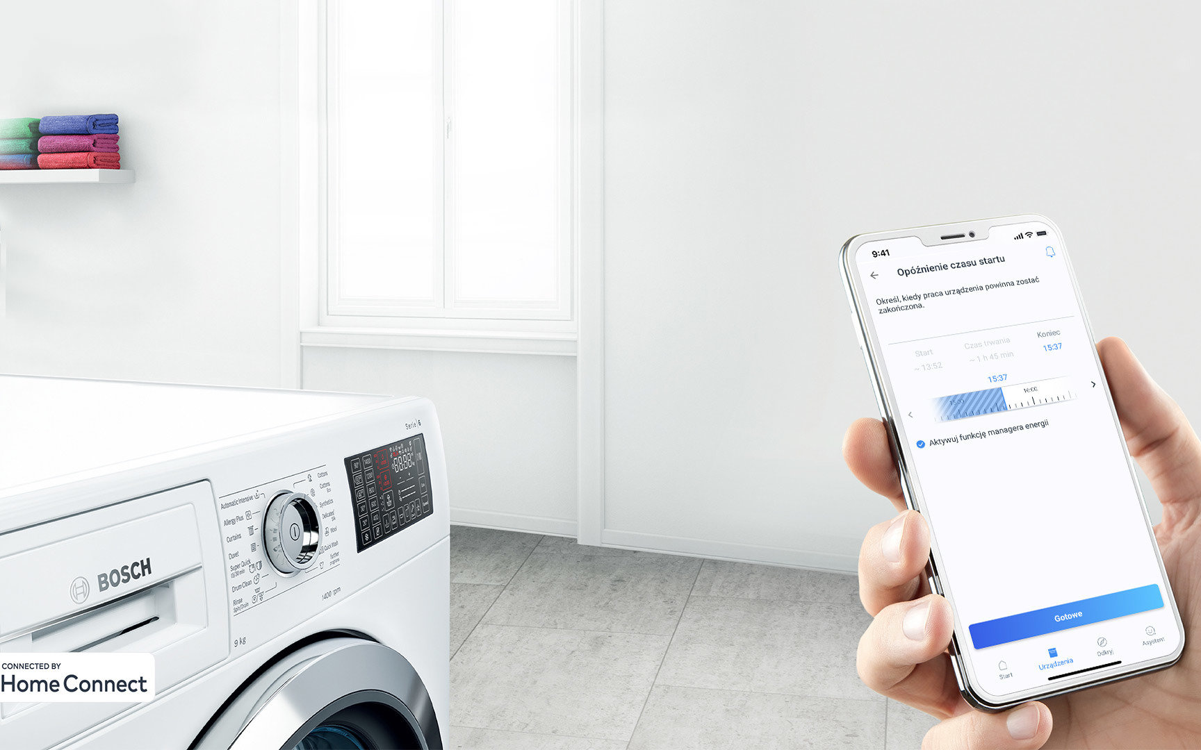 oraz monitorować wszystkie inne procesy. Dzięki aplikacji Home Connect można zapytać Alexę lub Asystenta Google, jak długo potrwa bieżący cykl prania.