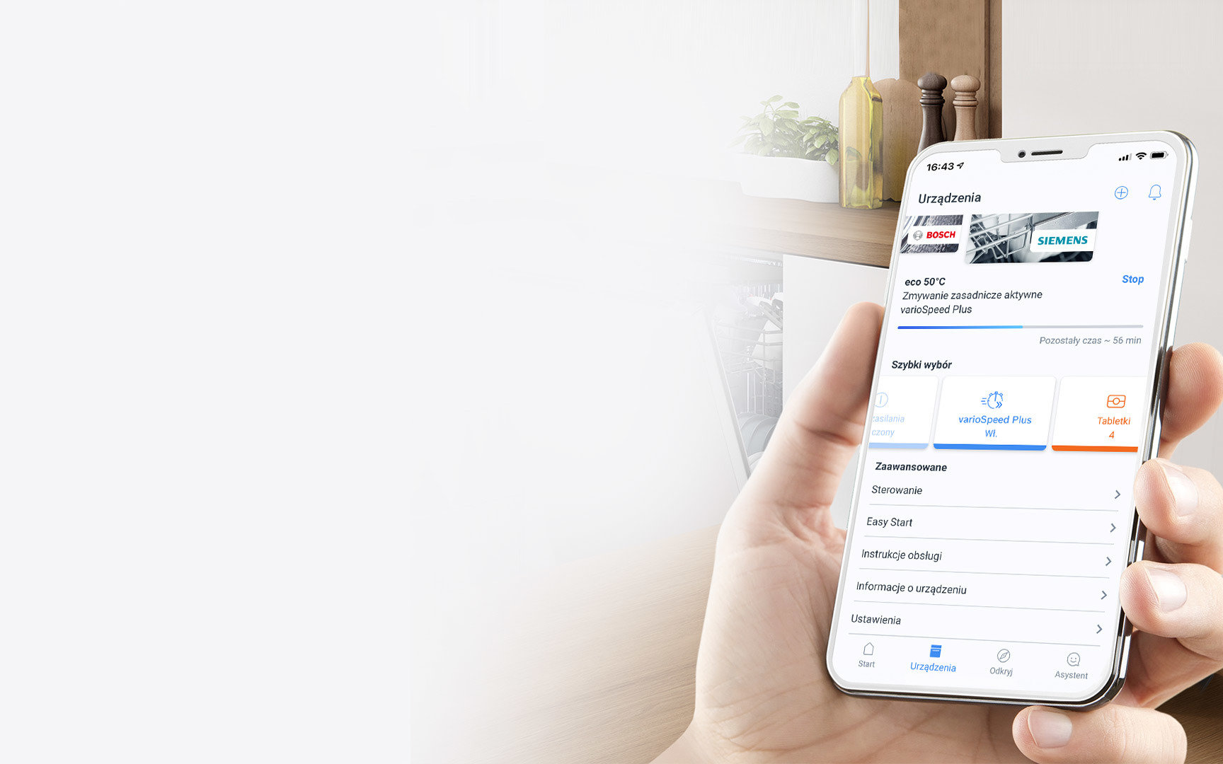 lub Google przez aplikację Home Connect można włączyć lub wyłączyć zmywarkę poleceniem głosowym, można też włączyć funkcję Speed