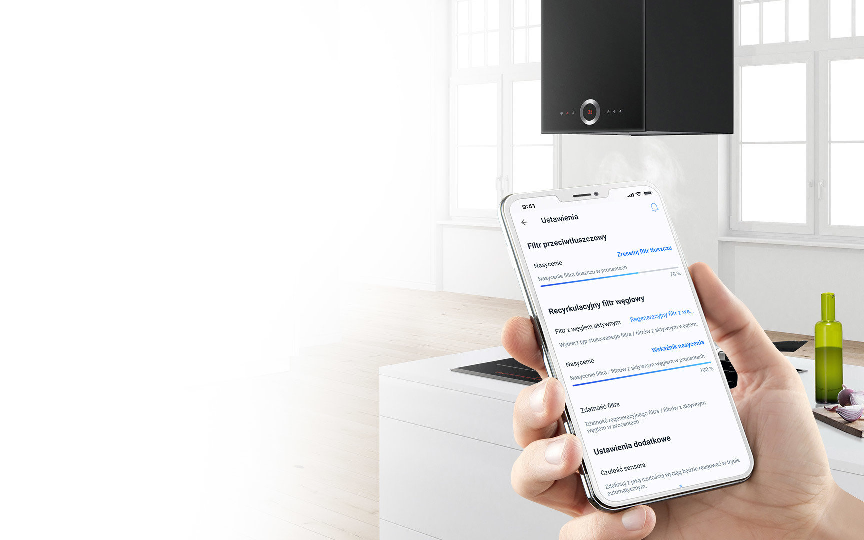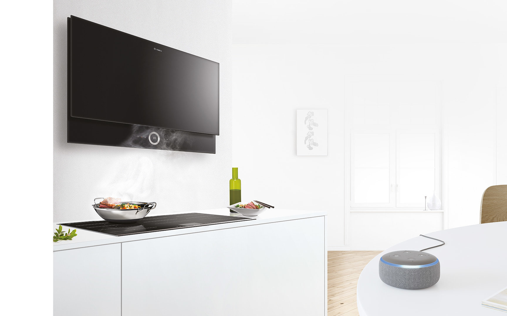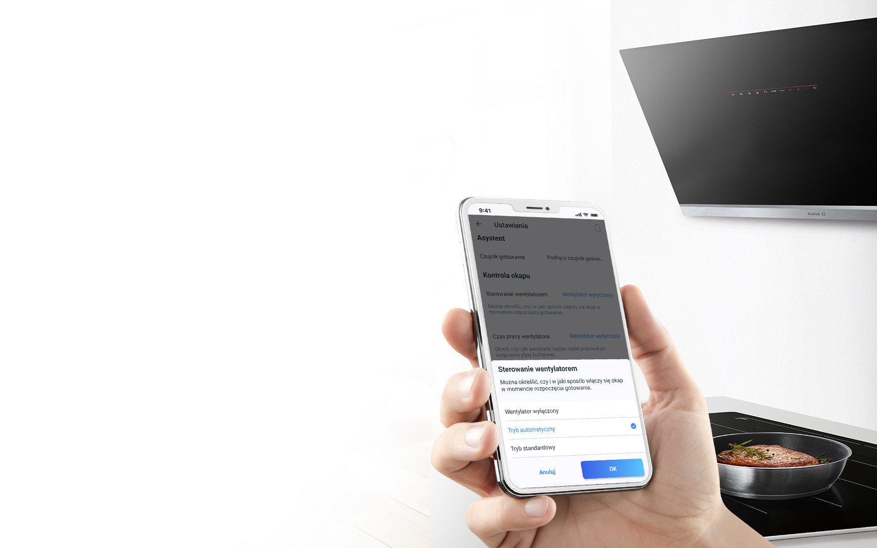 na łatwe włączanie i wyłączanie okapu kuchennego oraz regulację mocy nawiewu za pomocą sterowania głosowego. Dzięki aplikacji Home Connect można